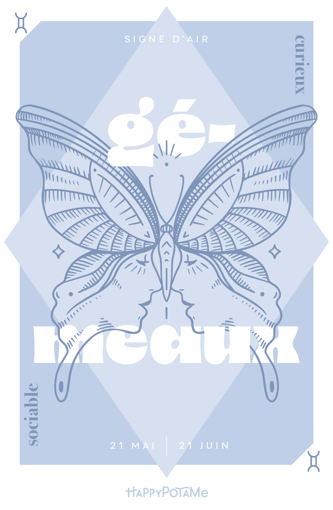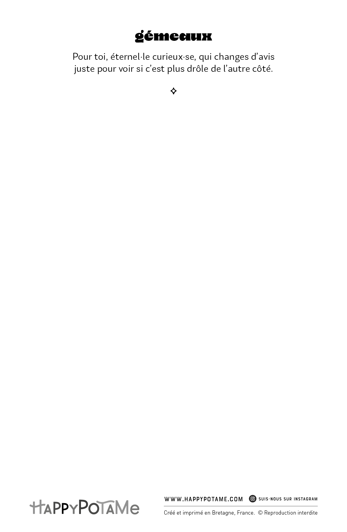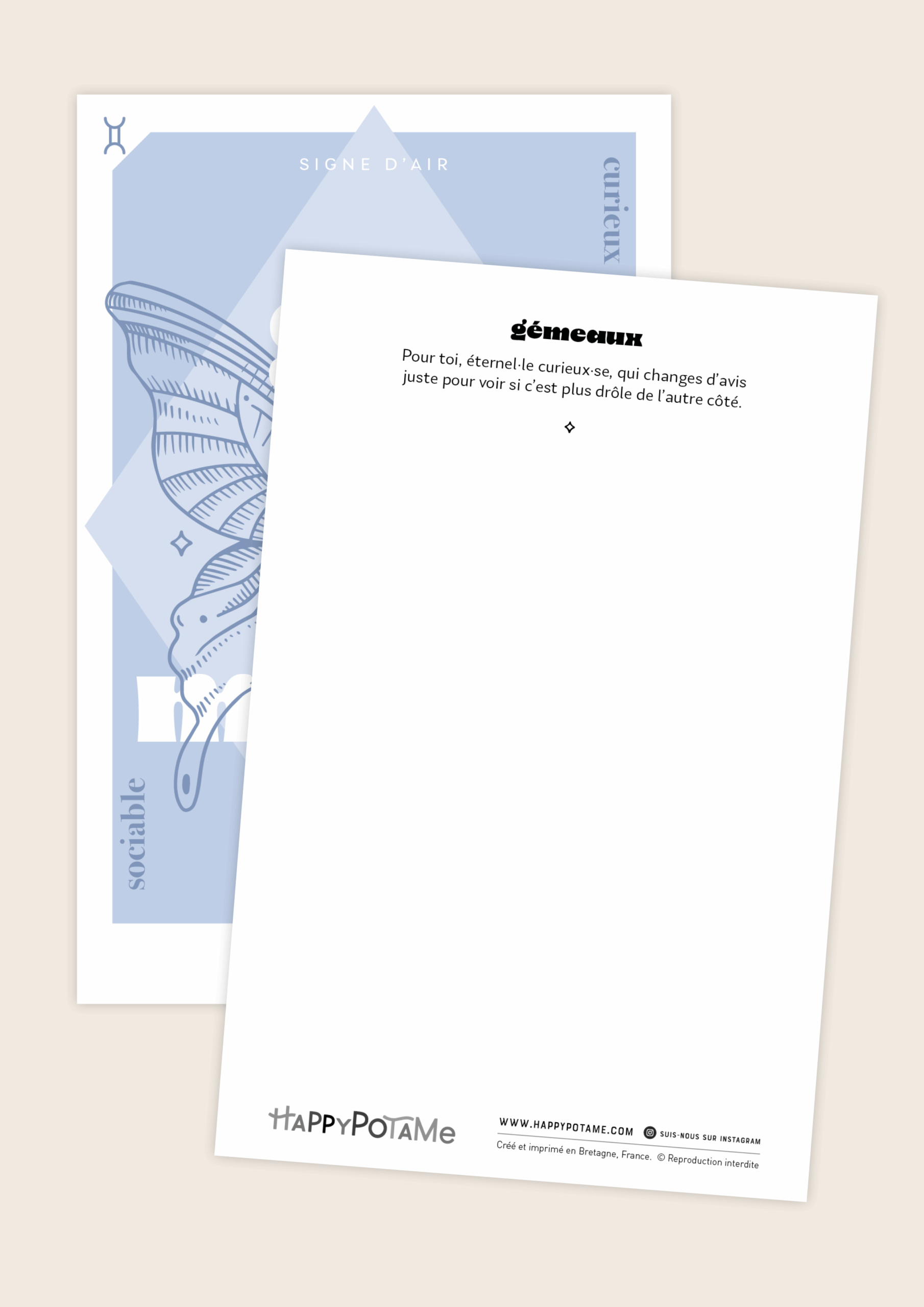 La phrase qui l’accompagne – « Pour toi, éternel·le curieux·se, qui changes d’avis juste pour voir si c’est plus drôle de l’autre côté. » – capture avec humour l’âme aérienne, vive et changeante de ce signe d’air.