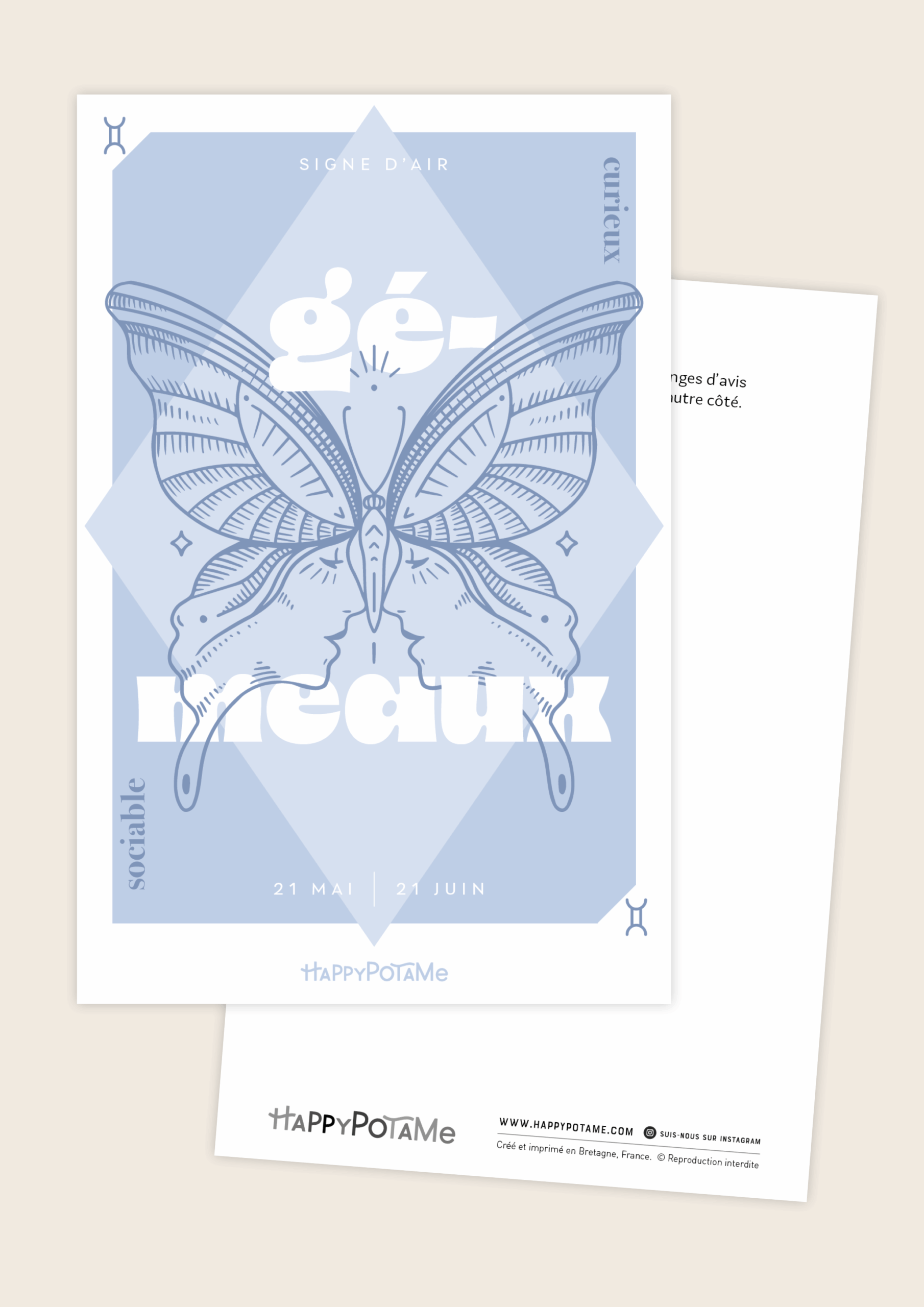 Faites passer un message léger et pétillant avec cette carte postale inspirée du signe des Gémeaux.